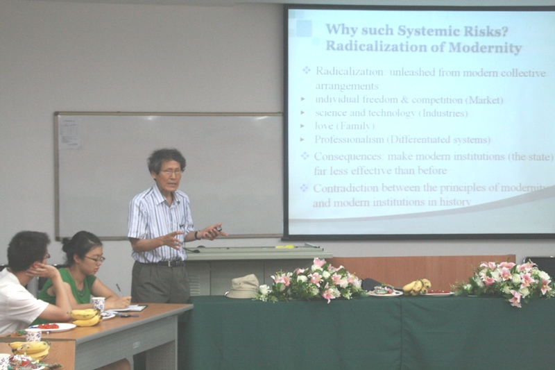 首先,韩教授就其研究内容发表了演讲,指出二次现代性和自反性现代化是历史趋势,它深深的影响了东亚地区。而作为二次现代性的推动力,全球风险在东亚更具有关联性,同时,东亚挤压式现代性使得东亚国家面临风险的复杂度和密度更甚于西方。但是集体意愿和渴望的文化逻辑表达使东亚在二次现代转型中调节行动的拉力与西方有很大的不同,而且个体化和国际化的具体途径也有所不同。即使在东亚内部,各国通往二次现代性的具体道路也有所不同,韩教授就中、日、韩的具体国情给予了具体分析。