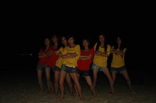 酒足饭饱,月已当空。海滩上,早已架起音响,在传播学女生们的青春舞曲之后,联欢晚会开始了。晚会期间,全院师生大展才艺:雅俗共赏的歌曲串烧“换大米进行曲”令在场观众笑声不断;恶搞话剧“大话西游”更是搏得满堂彩,演员们惟妙惟肖的表演,夸张搞笑的肢体动作,进一步将晚会气氛调动起来;由10级社会学的全体同学们表演的“桃花朵朵开”,将男女速配过程展示得淋漓尽致;相声节目幽默诙谐,二位男生尽展“说学斗唱”之才;“水果蹲”游戏活泼俏皮,惩罚环节刺激又过瘾;民族歌曲“火把节的火把”、流行歌曲大连唱等歌唱类节目可谓赏心悦目,台上台下瞬间变为一片歌唱的海洋。