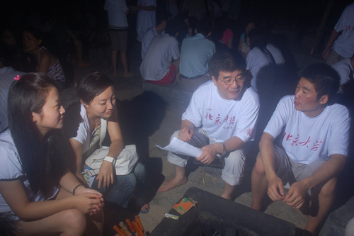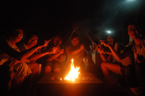 下午玩水,晚上玩“火”,于长江老师这样笑言西冲活动的安排。下午六点多钟,同学们开始了分组海滩自主烧烤,每个小组都有来自传播学、社会学和心理学三个不同专业的同学,以便让不同的专业、不同的思维模式的同学互相了解,让整个人文学院真正成为一个亲密无间的大家庭。看到学院精心准备了牛肉、猪肉、鸡翅、烤肠、玉米、茄子、面包等,同学们不断地发出赞叹声,烧烤的作料和用具如蜂蜜、油、盐和锡箔纸等则让同学们感受到学院老师们的细心周到。一时间,海滩上香味四溢,同学们聊得热火朝天,“烧烤达人”们的自我宣传非常搞笑。而海闻校长来到各个小组和同学们开怀畅饮则让烧烤晚会掀起了一个高潮,他祝愿新同学在南国燕园生活愉快,学业有成,一切顺利。