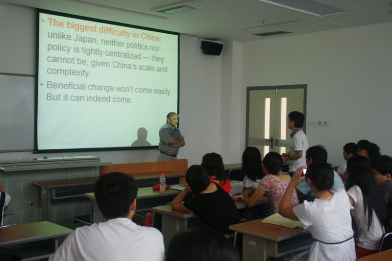 李老师首先对涂教授进行了简单的介绍,他笑称涂老师经历十分丰富——出生在大陆,成长在台湾,家在美国,工作在香港——因此同学们可以在各方面展开提问,涂教授十分乐意解答。涂教授对李老师的介绍表示了感谢,然后对本次讲座的题目进行了解释:力图说明目前中国的环境是怎么回事。他从人口与环境的关系这个方面展开了讲演,细述了人口的变化对环境造成的直接影响与间接影响,指出了在目前的环境状况坚持可持续发展的重要性。关于目前科学界中对环境问题持不同态度的“乐观学派”与“悲观学派”,涂教授也展开了阐述与对比。接着他对中国环境问题的持续恶化进行了批评,认为中国只专注于经济的增长而忽略环境的保护,不仅对本国造成了危害,也对全球环境造成了危害。他详细地剖析了目前各方面的环境问题,如水源危机、气候变化、空气污染、森林退化、土地沙漠化等等,认为正是对短期经济效益的片面追求导致了这些问题的恶化。涂教授表明目前中国在环境保护上其实存在着若干优势,如强大的公共财政与经济支持,全球在气候变暖问题上的关注等等。他以20世纪70年代的日本为例,指出只有真正改变发展战略,促进技术革新,提高资源利用效率,鼓励人民与政府的积极互动,中国乃至全球的环境才能真正得到良性的改变。