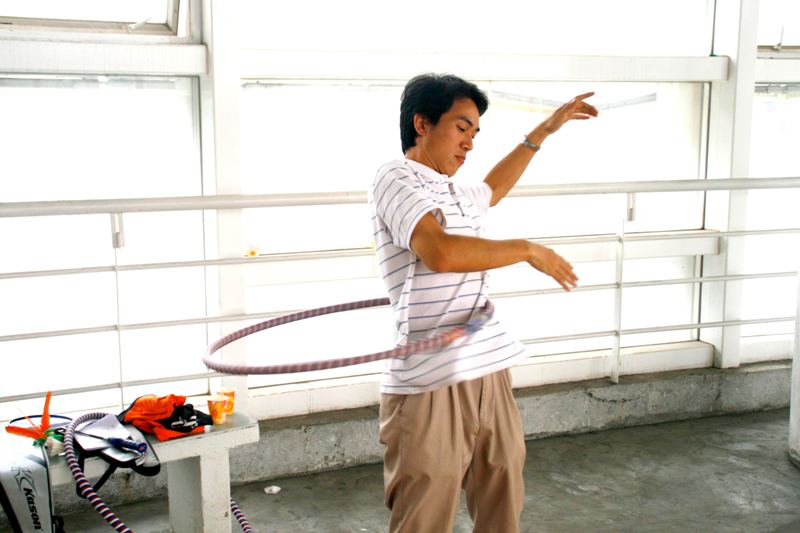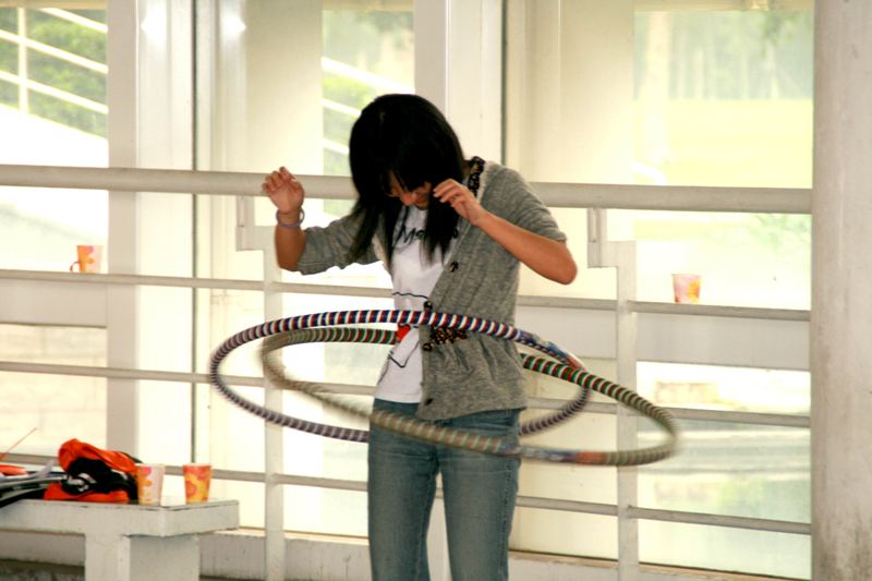 还有趣味横生的呼拉圈比赛,比赛规则设置了三个淘汰环节:第一个环节转一个呼啦圈,在一分钟之内数量超过60圈即可;第二个环节增加了难度,要求同时转两个呼啦圈,一分钟之内数量超过40圈才算合格;第三个环节则是同时转三个呼啦圈,比一分钟之内谁的转数最多。