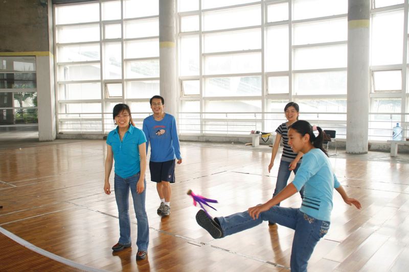 还有很多有意思的比赛项目,比如毽球的团队PK、两个人背靠背夹着篮球跑、羽毛球比赛、跳绳比赛……羽毛球馆内的气氛被同学们的热情所感染,大家都融入其中,享受运动所带来的乐趣。