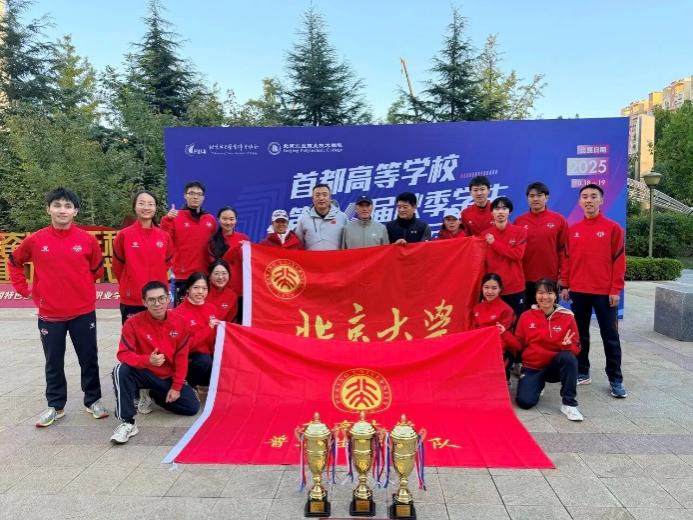 2025年10月,由北京市大学生体育协会主办、北京工业职业技术学院承办的首都高等学校第16届秋季学生田径运动会顺利举办。北大普通生田径代表队派出了11男、9女共20位运动员,与北京15所参与甲组比赛的高校优秀运动员们一较高下。经过3天激烈角逐,北京大学普通生田径代表队在领队王东敏老师和教练员郑重、刘茂辉、邢衍安、李玉新、李贵森、李宁、李敬敬、覃峨等老师的带领下,摘得1金5银5铜,打破6项校纪录(女子5000米,男子110米栏、女子1500米,男子4*100米接力,女子4*100米接力,混合4*400米接力),最终获得男女团体总分第3名、最佳参赛组织奖、男子团体总分第3名、女子团体总分第4名。